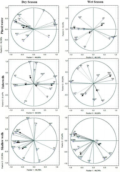 The possible interaction between physicochemical variables was analysed through principal components analysis (PCA) based on Euclidean distance. Figure 2 shows the PCA plots showing the relationship between those parameters for each of the three water sources studied in the dry and wet seasons. For piped water, in the dry season, it seems that the development of faecal coliforms and AMM can be associated with high NO2− levels as well as by high Cr(VI) levels, while for the wet season, the multivariate analysis suggests that the FC concentration can be associated with the levels of SO32− as well as NO2− and NO3−. TDS and AMM, whose concentrations increase with pH, probably due to a greater number of bacteria, can survive at a higher pH. Concerning tubewells’ water, in the dry season, results suggest a link between AMM development and the levels of TP, SO42− and Fe2+, and no relation between nitrogen compounds (NO2− and NO3−), while in the wet season, FC seems to be related to the levels of particles in suspension (TDS and turbidity). AMM is correlated with Fe2+, Cr(VI) and NO3−, while E. coli is correlated with NO3−. For shallow wells in the dry season, the results suggest a relationship between all the microbiological parameters and EC, TDS and SO32− but also NO2− and SO42−, while in the wet season, all but AMM microbial composition parameters, in particular, show a direct relation with Fe2+, SO42− and TP, but also with SO32−, NO2− and TA.