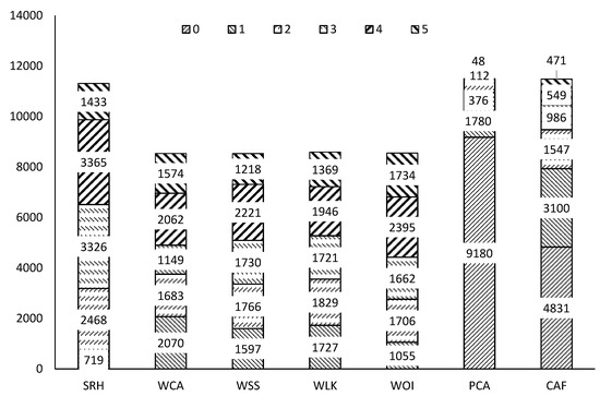 Column chart of six indicator variables. Note: SRH, self-rated health; WCA, willingness to participate in community affairs; WSS, willingness to serve society; WLK, willingness to learn new knowledge; WOI, willingness to obtain useful information; PCA, participation in community voluntary activities; CAF, community activity facilities.