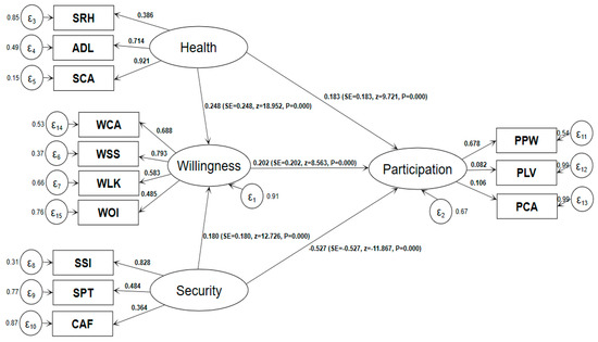 To obtain the total (net) effects of “health”, “security” and “willingness” on “participation”, we report the standardized coefficients in a path figure, as shown below.