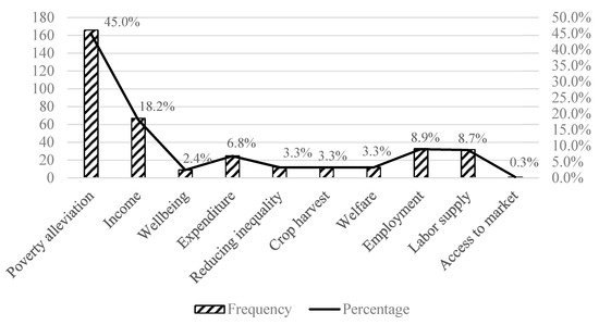 | Poverty alleviation | 70 (42%) | 27 (16%) | 97 (58%) | 22 (13%) | 47 (28%) | 69 (42%) | 166 (45%) |