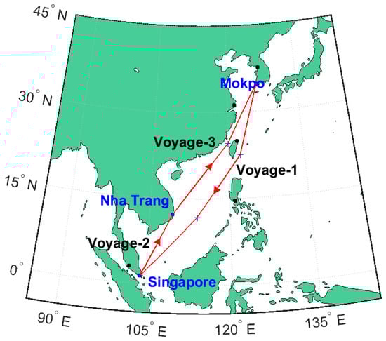 The annual sailing plan of the training ship that was employed in the study contained sixteen voyages per year. The annual sailing plan consisted of fourteen coastal voyages (i.e., sailing between Korean ports) and two international voyages. The experiment was conducted during the second semester, and experiment participants had experienced twelve domestic voyages and one international voyage before the experiment. Data were collected from participants on three sea voyages: (1) from the Port of Mokpo in South Korea to the Port of Singapore in Singapore (N = 23), (2) from the Port of Singapore to the Port of Da Nang in Vietnam (N = 11), and (3) from the Port of Da Nang to the Port of Mokpo (N = 17). At the beginning of each voyage, participants were asked to wear the wearable sensor at least for four consecutive days except while bathing. The sea routes, represented in Figure 1, totaled approximately 5100 nautical miles passing through the East China Sea, South China Sea, Singapore Strait, and the Gulf of Thailand.