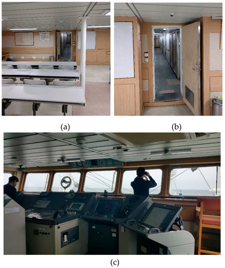 Ship accommodation including lecture room (a), hallway (b), and navigation bridge (c).