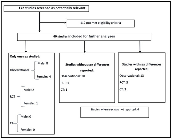 A flow chart of the literature search is shown in Figure 1. The search string returned 1456 potentially relevant article citations. After systematically reviewing all the abstracts, 776 irrelevant studies and 508 duplicate papers were removed. Two independent investigators screened the remaining 172 full-text studies for eligibility and found that 35% of articles (60 studies including 7501 subjects; age range 12–67 years) met the inclusion criteria. These were categorized according to whether they reported sex differences in measured outcomes, and/or included male and female participants in the research design (Figure 2).