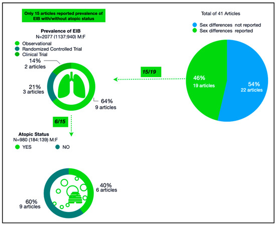 Compared to the general population, elite athletes have a higher prevalence of EIB that varies with the intensity of exercise and the environment [75]. Increased bronchial responsiveness and asthma are strongly associated with atopic disposition and its severity in elite athletes [92], and atopic diseases are overall more common in athletes [93]. Our analysis of the literature revealed that 23% of the athlete population studied presented with EIB. Interestingly, the severity and prevalence of EIB was even higher (30.3%) in studies that reported sex differences. Our data also concur with prior research reporting a greater prevalence of EIB in high-performance athletes than in the general population. These studies suggested that prolonged inhalation of cold, dry air, and airborne pollutants are some of the factors influencing the high prevalence of EIB in athletes [14]. Other studies have reported a prevalence of EIB between 30–70% among elite or Olympic-level athletes [19,58], as opposed to 5–20% in the general population [75,94]. While EIB is frequently documented with asthma and reflects insufficient control of underlying asthma, few epidemiological studies of EIB have categorized participants by asthma status. Thus, the true prevalence of EIB within the non-asthmatic general population has not been fully established, preventing researchers from evaluating and quantifying sex and/or gender differences as well. In this regard, a sex disparity in EIB and airway hyperresponsiveness (AHR) has been reported in young adults, with lower rates of mild AHR in males vs. females but higher rates of moderate AHR and atopy in males [95]. In the United States, 56.3% of asthma cases are attributable to atopy, a percentage that is greater among males than females [12,96]. Repeated and strong exposure to pollen and other allergens causes bronchial and upper respiratory symptoms in athletes, although very few studies have investigated occurrence of atopic status in athletes [97]. Our analysis revealed that the male sex and atopic status are potential risk factors for EIB in athletes. We also identified a 2:1 ratio of atopic EIB in male vs. female athletes. However, female athletes were overall underrepresented in studies assessing EIB, as is the case for studies in many lung diseases [98].