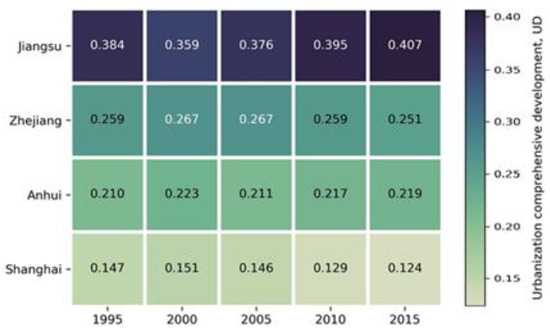 The UD ranking over five periods revealed that the cities that were always in the top 10 were the major cities that constituted the region’s urban centers (Table 1). Jiangsu, Zhejiang, and Anhui provinces accounted for 50%, 30%, and 10% of the cities, respectively. The UD values for these 10 cities varied over time, but this was mainly reflected in changes of their ranking (Table 1 and Figure 3). Shanghai maintained the number 1 rank in the region, but its UD value decreased from 0.147 to 0.124 over the 20-year period. The rankings of Nanjing, Hangzhou, and Suzhou also remained stable at second–fourth, respectively, although their UD values increased. Of the remaining cities, Wenzhou and Hefei changed the most during the study period; Hefei moved up from tenth (0.029) to fifth (0.042), while Wenzhou dropped from fifth in 2000 (0.041) to tenth (0.034) in 2015. This variation was a consequence of the changing dynamics and rates of urbanization.