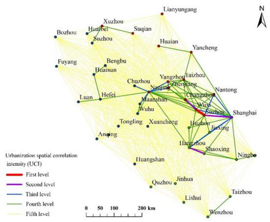 The distance correlation strength of urbanization in the YRD region also showed obvious spatial distribution characteristics (Figure 4), and the high UCI grades were centered in the east. Shanghai, Suzhou, Wuxi, and Changzhou were strong links in the development of urbanization, and the urbanization development of Suzhou and Wuxi showed a “twin star” structure with strong spatial links. The connections among these cities were in the first and second grades. Nanjing and Hangzhou formed the cores of their own urbanization network. Hangzhou and Shaoxing had the strongest correlation followed by Shanghai and Jiaxing, while Nanjing had strong spatial links with Yangzhou and Zhenjiang. Overall, Shanghai, Suzhou, Nanjing, and Hangzhou constituted the most densely urbanized spatial network, which indicated that there were obvious spatial agglomerations and connections in the development of the YRD region. The UCI showed the strength of the spatial linkages of each city and it indicated their respective impact. From this perspective, the UCI to some extent represented the network of interconnection.