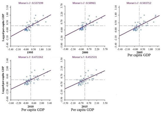 This study used the local Moran’s I to derive Moran’s I scatter plots and LISA plots for the five equal periods from 1995 to 2015 in the YRD region. The spatially significant positive correlation of GDP per capita in the YRD region in each year indicated that economic development in this region was spatially highly agglomerated (Figure 5). Regions around areas of high GDP per capita also had high values. However, this feature weakened over time. During the study period, the Low–Low (L-L) zones within the YRD region reduced from nine to six, while the High–High (H-H) zones increased from six to seven (Figure 6).