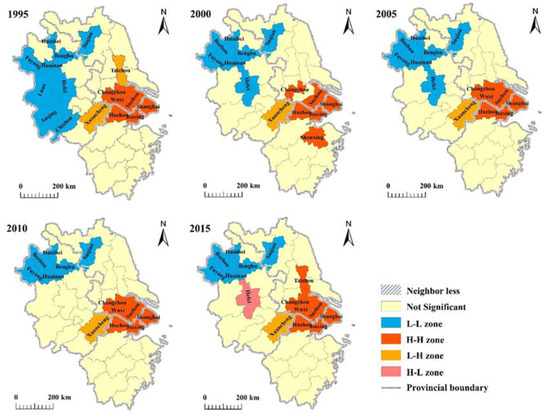 LISA agglomeration maps of the YRD region from 1995 to 2015.
