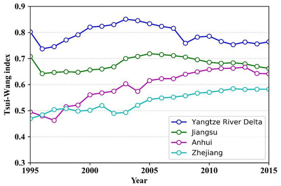 Comparison of the Tsui–Wang index of each province in the YRD region from 1995 to 2015.