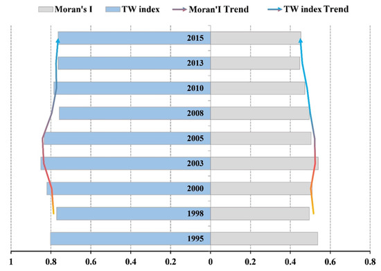 Overall, polarization within the region was pronounced. The polarization index of the YRD region reached its highest value around 2003 and then declined. It remained stable at around 0.75 after 2010, which indicated increasing spatial integration and connection of urbanization in the YRD region. This was because of the cascading economic development from coastal/river cities to inland areas. Shanghai was the first city in the region to benefit from this, and then some of its production began to move to neighboring cities. Suzhou and Wuxi were the first to receive industrial radiation from Shanghai because of their strong spatial connections with the city. In recent years, the main growth poles of the YRD region have evolved from points to bands and extended inland, indicating that the radiation effect of the core growth area has reached inland areas. Comparison of the TW index and Moran’s I in the YRD region revealed that both indices first increased and then decreased (Figure 8). Polarization in the YRD region intensified between 1995 and 2003, but then weakened as spatial development subsequently became more balanced.