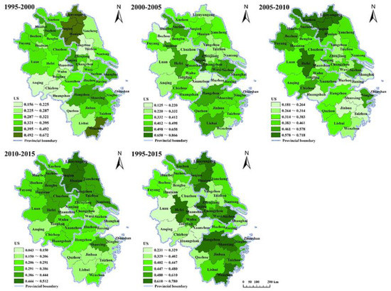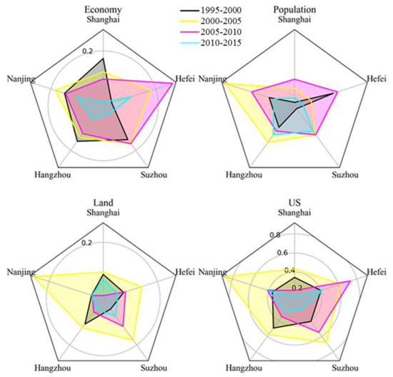 There were distinct phases in the rate of urbanization specific to each city. Hefei had a remarkable polarization effect in Anhui Province as its US increased significantly between 1995 and 2010, and the value remained higher than that of its neighbors after 2010. It was not possible to observe the progress of Shanghai’s polarization enhancement to the periphery within the study period, but it was clear that Shanghai’s pattern of diffusion spread inland after 2000. Hangzhou, Nanjing, and Suzhou were all the focus of increasing polarization, which then weakened in the subsequent process of urbanization (Figure 9).
