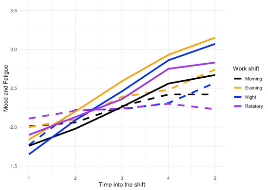 Evolution of mood and fatigue during the shift: Continuous lines represent mood and dashed lines represent fatigue. The higher values reflect negative mood and high fatigue. The range 1–5 of the dependent variables is limited to 1.5–3.5 for better visualization.