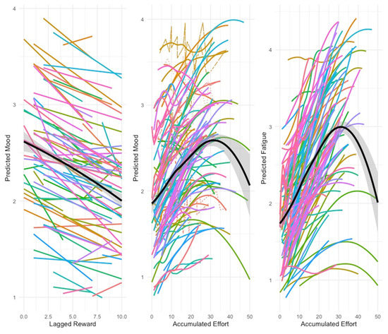 Fatigue could be explained by the current and lagged effect of effort, and by the lagged effect of reward. When stress accumulated, fatigue was explained by the accumulated effort following a concave, quadratic trend (Figure 3, third spaghetti plot), while accumulated reward diminished fatigue (Table 1, first section). Accumulated effort also worsened mood only up to a given value, after which it decreased mildly.