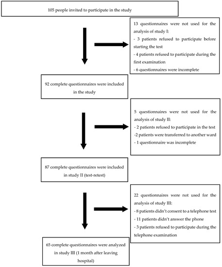 All consecutively admitted patients with chronic LBP from June 2019 to March 2020 meeting the inclusion criteria were qualified for the study. The study was conducted by properly prepared and trained physiotherapists in the rehabilitation ward. The investigation was performed using a direct interview implementing a pen and paper interview method. The examination was carried out three times: study I—in the first day after hospital admission using the following tools: the 36-item WHODAS 2.0, the SF-36 Health Survey (SF-36), ODI, the Hospital Anxiety and Depression Scale (HADS), the Visual Analogue Scale (VAS), and sociodemographic data were also collected; study II—mainly two days after the study I (using the WHODAS 2.0) and study III–1 month after the completion of rehabilitation in the hospital (to assess responsiveness, the WHODAS 2.0 and VAS were used) (Figure 1).