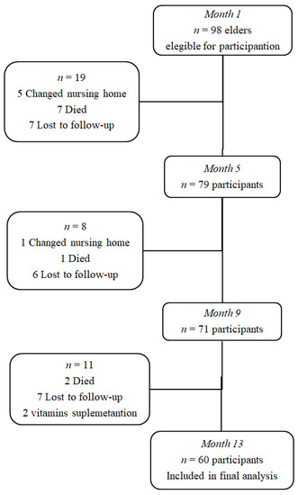 Two families of biomarkers are usually used to monitor the health of older people assessing cardiovascular risk factors, those related to lipids (total-cholesterol, HDL-cholesterol, LDL-cholesterol, triglycerides, apolipoprotein A1, apolipoprotein B) [7], and those related to vitamin B12 status (serum cobalamin, holo-transcobalamin, serum and red blood cell folate, and homocysteine) [8]. However, studies reporting results simultaneously from both types of biomarkers, muscular strength and cognitive status, and their evolution are scarce, especially for seniors living in homes for older adults. The purposes of this study were to monitor over the time and investigate the relationship among these parameters over one year, in institutionalized older adults.
