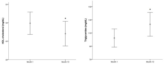 Two biomarkers related to lipid profile worsened significantly throughout the year: Mean HDL-cholesterol decreased (p < 0.05) while mean triglycerides showed an important increase (p < 0.001) (Figure 3). The other means showed no significant differences throughout the year. The highest prevalence biomarker concentrations above reference range were observed first for LpA (52–53%) followed by LDL-cholesterol (33–38%) and total-cholesterol (30–38%). The number of subjects presenting low HDL-cholesterol values increased over a year (13–22%) while high triglyceride concentrations were found in 10% of the population at the beginning of the study and in 20% of subjects at month 13.