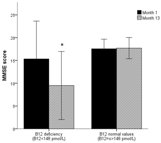 It is important to note that, subjects with sCbl deficiency at the beginning of the study showed lower MMSE scores (p < 0.001) and there was a worsening of the MMSE scores for the sCbl deficiency group one year later. Subjects with normal sCbl values showed similar MMSE scores at the beginning and the end of the study (Figure 4)).