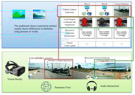 Virtual reality (VR) is a high-technology, simulated system manufactured through computer assistance. A sense of space is created through computing, while substances in reality and digital data are turned into a simulated three-dimensional environment, which can be seen or even touched. Users can choose between various input and output equipment, be submerged into a three-dimensional space, and become direct participants in the virtual scene. Interactive, immersive, and real-time features create a vast difference between VR and traditional 3D animation. VR is now extensively applied in research encompassing virtual tours [49,50], shopping [51,52,53], education [54,55], virtual appreciation [56], visual and audio experiences [57], medical treatment [58,59], and disaster prevention [60,61]. A scene simulated by VR reflects more of the real world and diminishes cognitive bias compared to a description using words [62]. Innocenti suggested that in addition to reducing cognitive bias, contingency variables are strictly under control using VR [63]. In view of this, scholars have started combining applications of VR and CEM. Matthews et al. demonstrated various situations of coastal erosion using VR and employed CEM to exemplify the efficiency of coastal protection by tourist inflow [40]. Rid et al. used VR to illustrate a view of houses and their building styles while applying CEM to estimate consumers’ preferences and weigh future development directions [64].