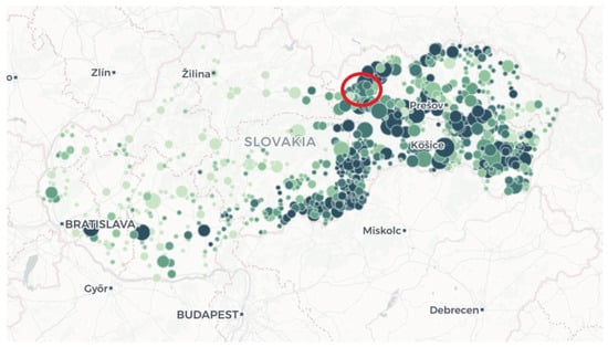 Currently, according to qualified estimates, there are about 440 thousand Roma in the Slovak Republic [19], which is about 8% of the total Slovak population. They live either integrated within the majority population or scattered in groups with various degrees of concentration (Figure 1).