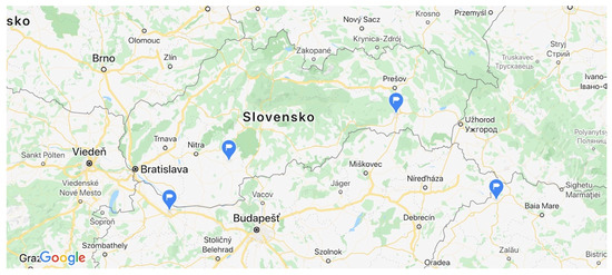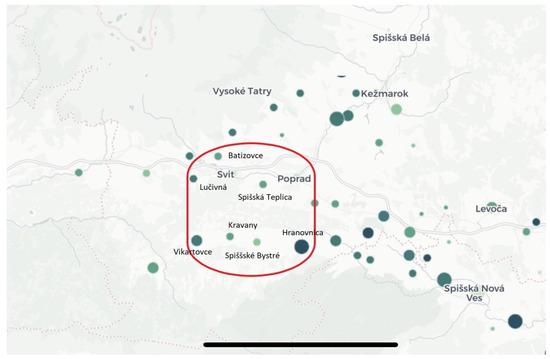 Data collection sites (Poprad, Spisska Teplica, Hranovnica, Spisske Bystre, Vikartovce, Kravany, Lucivna, Batizovce) adapted from Kerekes, 2019 [20]. For the larger and darker circles see Figure 2.