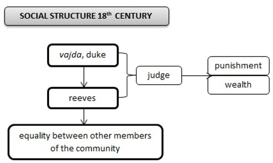 Augustini [34,35] considered the social establishment of all Gypsies in what was then the territory of Hungary to be the same. He attributed the leadership position in the community to the vajda. He describes the vajda’s position vis-a-vis the authorities and his relationship with his own people. In addition to the term vajda, the expressions duke, prince or king were used to refer to a leader. Augustini states that Gypsies came to Germany with Duke Michal, and to Italy with Duke Andrej, and they were brought to Bavaria by King Zindanel. He claims that their titles served for external effect and communication with the authorities.
