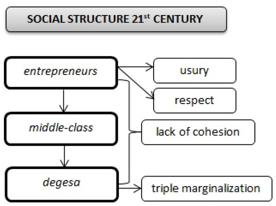 In summary, our comparison of the social structure and internal establishment of Roma communities in two historical periods has revealed considerable differences. They include mainly the change in the internal community establishment. While in the second half of the eighteenth century, there was a “vajda” at the head of a group, and later each larger Roma community elected a reeve, who was a sort of local authority potentially linking the majority and Roma with some actual power on a local level, in the present day, the privileged positions are held by rich family clans respected by the rest of the community, who are often engaged in usury and possess economic and social power. The socially lowest class is the group of “degesa”, who are seriously threatened by triple marginalization; on top of double marginalization (geographic and economic), these people also face exclusion within their own ethnic group. This form of social structure is typical, although not universal for the segregated settlements and separated groups. In addition to these findings, we draw attention to the still-existing stereotyped ideas of the homogeneity of Roma society. Furthermore, we question the usefulness of ethnicity-based approaches for the helping professions.