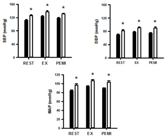 Systolic blood pressure (SBP), diastolic blood pressure (DBP), and mean arterial pressure (MAP) during dynamic exercise and post-exercise muscular ischemia (PEMI) in normal and obese individuals. Black bar, normal; open bar, obese. * p < 0.05, vs. normal individuals.