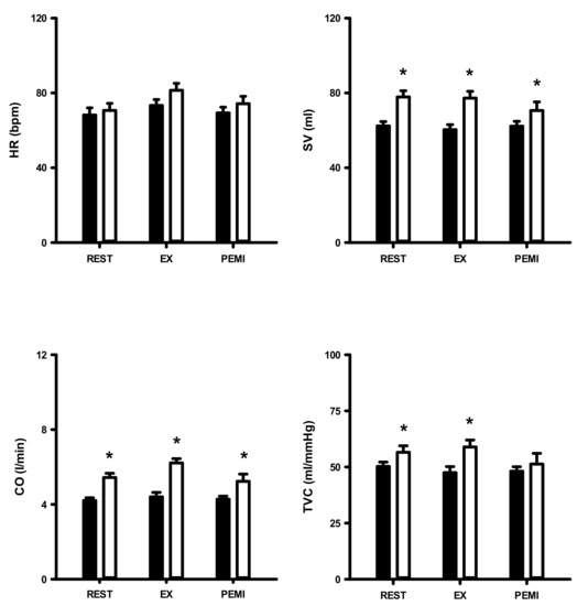 - Choi, H.M.; Stebbins, C.L.; Nho, H.; Kim, M.S.; Chang, M.J.; Kim, J.K. Effects of ovarian cycle on hemodynamic responses during dynamic exercise in sedentary women. Korean J. Physiol. Pharmacol. 2013, 17, 499–503. [Google Scholar] [CrossRef]