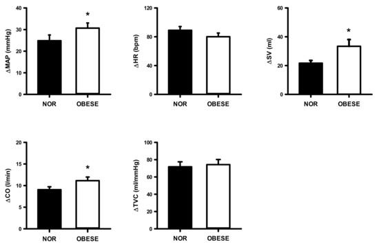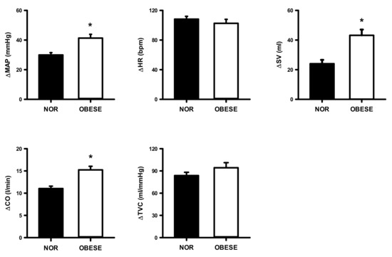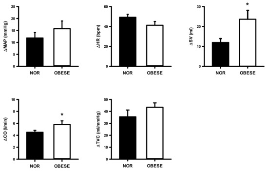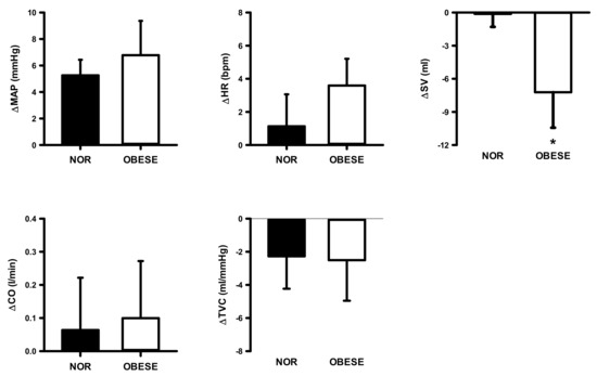 Changes from rest in mean arterial pressure (MAP), heart rate (HR), stroke volume (SV), cardiac output (CO), and total vascular conductance (TVC) during the 60% of VO2peak workload in normal and obese individuals. Black bar, normal; open bar, obese. * p < 0.05, vs. normal individuals.