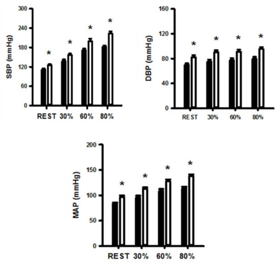 Systolic blood pressure (SBP), diastolic blood pressure (DBP), and mean arterial pressure (MAP) at rest and during dynamic exercise in both normal and obese individuals. Black bar, normal; open bar, obese. * p < 0.05, vs. normal individuals.