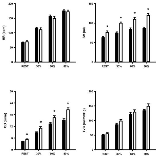 Figure 6 shows SBP, DBP and MAP at rest and during aerobic exercise in the OG and NOG. The SBP, DBP and MAP were significantly increased in both groups, but these variables were significantly higher in OG than NOG when exercise intensity increased from rest to heavy exercise. Figure 6 shows HR, SV, CO and TVC at rest and during aerobic exercise in both groups. There was a higher increase in SV and CO in OG compared with NOG during increasing workloads, whereas no significant differences in HR and TVC occurred.