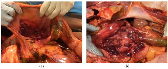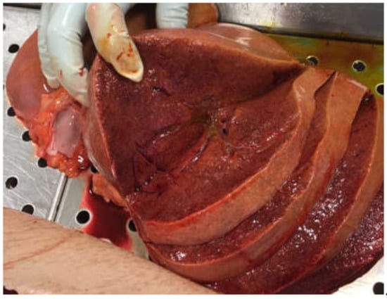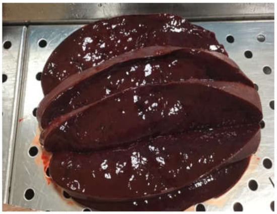 In 2015, a 50-year-old man underwent surgery due to mitral valve insufficiency. The intra- and post-operative period appeared regular with good recovery. After approximately 12 months, the patient noted general symptoms of fever and fatigue, and valvular endocarditis caused by MC was detected, which subsequently required replacement surgery. Antimycobacterial therapy was administered, first with rifampicin, ethambutol, and clofazimine, and then continued with ethambutol and clofazimine. For several years, the infection seemed to be under control, although the patient did show inability to exert himself, marked asthenia, and susceptibility to infections. In 2020, five years after surgery, the patient’s condition rapidly deteriorated due to weight loss, worsened asthenia and skin discoloration. His hematochemical tests highlighted significant renal and hepatic insufficiency with elevated pancreatic indices. Moreover, 30 days after the onset of these symptoms, the patient was hospitalized due to severe pancreatitis and died a few days later. The autopsy revealed the presence of pancreatitis involving the omental tissue (Figure 1a,b), a significant increase in the dimension (approximately 30 × 15 cm) and weight (1.3 kg) of the spleen (Figure 2), congestion, and cirrhotic degeneration of the liver (Figure 3), in addition to severe destruction of the renal parenchyma.