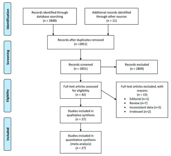 After completing the literature search protocol, 27 studies [,,,,,,,,,,,,,,,,,,,,,,,,,,] with the total of 4452 patients were found to meet the inclusion criteria and were included in the analysis following thorough assessment (Figure 1).