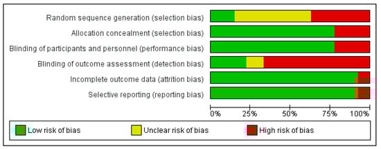 Each study was individually assessed for possible bias according to the before mentioned criteria. In the majority of studies there was a low risk of bias in terms of allocation concealment and blinding of participants and personnel as well as in the attrition and reporting bias. On the other hand, the risk of the detection bias–blinding of outcome assessment was considered high in the two thirds of publications. The random sequence generation bias was mostly marked as unclear due to the imprecise or uncertain data provided. The results of the risk of bias estimation are graphically presented (Figure 2).