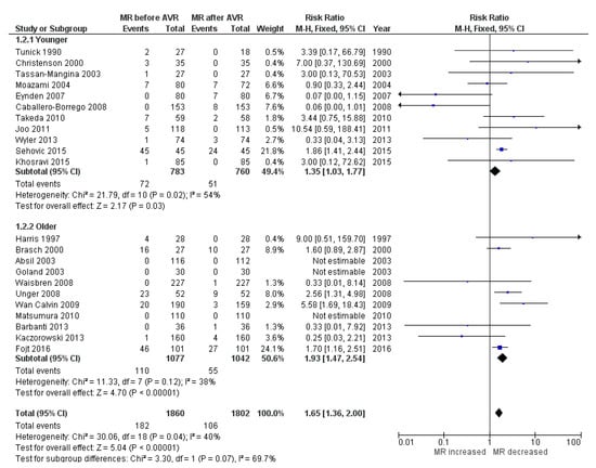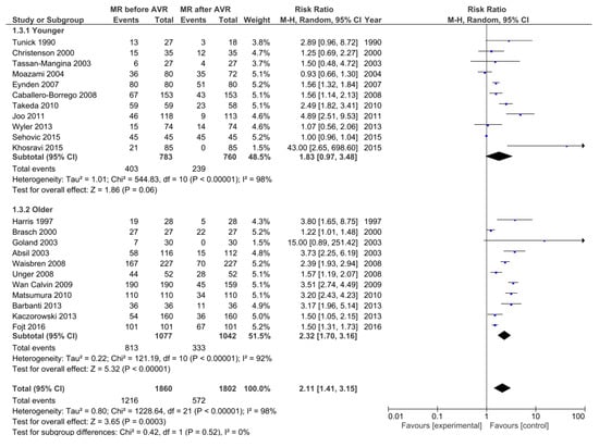 The decrease in MR severity postoperatively was also evident with composite outcome of moderate/severe MR (RR, 2.11; 95% CI 1.41–3.15; p = 0.0003; I² = 98%), although this time with marked inter-study heterogeneity. Subgroup analysis considering younger and older patients showed that the effect was significant only in older patients (2.32; 95% CI 1.70–3.16; p < 0.00001) but not in younger patients (1.83; 95% CI 0.97–3.48; p = 0.06) (Figure 4).
