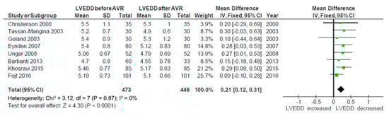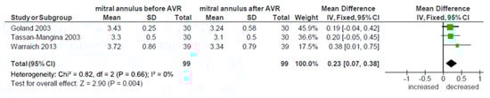 The change in EF after AVR was reported in nine studies [,,,,,,,,]. The analysis showed early increase in EF after surgery, but the result did not reach statistical significance (p = 0.14, WMD −1.02; 95% CI −2.36, 0.32; I² = 0%). There was no heterogeneity between studies. All these studies except one [] also provided data about LVEDD, both before and after the intervention. Evidence of structural remodeling was demonstrated by significant reduction in the diastolic diameter of LV (p < 0.0001, WMD 0.21; 95% CI 0.12, 0.31; I² = 0%), which is shown in Figure 6. There was no heterogeneity between studies in terms of this parameter. Finally, three studies [,,] measured the change in mitral annulus dimension. Pooling these results showed significant decrease in its diameter (p = 0.004, WMD 0.23; 95% CI 0.07, 0.38; I² = 0%), once again without significant heterogeneity (Figure 7). Further analysis of other echocardiographic parameters of reverse remodeling was impossible due to the lack of data reported.