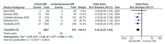 The overall 30-day mortality was reported in seven studies [,,,,,,]. Analysis of pooled data for these patients demonstrated a 5% relative risk of 30-day mortality after AVR. Significant heterogeneity between studies was not present. Five studies [,,,,] compared 30-day mortality between groups of patients that had nil/mild versus moderate/severe grade of MR preoperatively. Combining these data revealed a significantly higher mortality rate in the moderate/severe group (p < 0.0001; I² = 0%, Figure 8.)