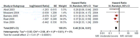 In the following five studies [,,,,] the Kaplan-Meier long-term survival curves were presented. The data provided compared survival rates between groups based on preoperative MR severity. Analysis of pooled estimates showed significantly better survival of patients that had nil/mild versus moderate/severe MR preoperatively (p < 0.00001; I² = 0%), without inter-study heterogeneity. The data referred to the follow up period of 5 years (Figure 9).