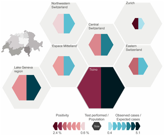 Representation of the seven greater regions of Switzerland (displayed as grey area) of the positivity for Legionella spp. testing (colour of left part of the smaller hexagon), the number of tests performed in relation to the resident population (size of smaller hexagon) and the ratio of the number of observed cases to expected cases (colour of right part of the smaller hexagon), based on the testing data of 14 Swiss diagnostic laboratories (2007–2016). The expected cases were calculated based on the relative population size of each region to the overall Swiss population and the proportion of each region of all cases (in our dataset).