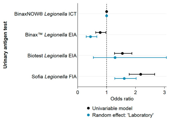 Differences in positivity across UAT test kits. Univariable regression results with and without random effect on “laboratory” for the outcome of having a positive test result for Legionella spp. in Switzerland, 2007–2016.