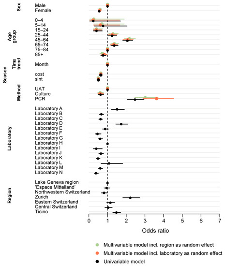 Both multivariable mixed-effect logistic regression models (with the inclusion of “region” or “laboratory” as random effect, respectively) are shown in Figure 5 together with the results of the univariable models. The estimates are comparable for all variables. The marginal but statistically significant negative OR for the time trend-variable, however, lost its statistical significance in both multivariable models.