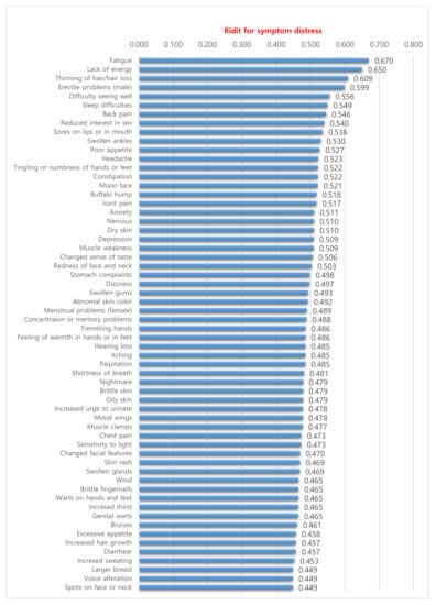 In this study, the most common symptoms and cause of distress for kidney transplant recipients were fatigue, lack of energy, thinning hair/hair loss, and erectile problems (male). In previous studies, prominent adverse symptoms experienced were mainly physical, such as moon face or increased sweating, but this study found more psychological factors related to functioning, such as fatigue or lack of energy [,]. For kidney transplant recipients, emotional and psychological aspects are more associated with quality of life than physical adjustment [,]. In other words, the general weakness and psychosocial factors were the presenting and distressing symptoms, consistent with the results of this study. In contrast to other studies, erectile problems were the main symptom occurrence and symptom distress in male transplant recipients. Sexual dysfunction is a common problem in patients after kidney transplantation [,]. Results suggest that despite the use of immunosuppressants in solid organ transplantation, the symptoms experienced may vary depending on the anatomical location of the organ or the surgical procedure. The symptom experience associated with taking immunosuppressants in kidney transplant patients may differ from those of other organ transplants, so large studies should be repeated to provide additional insight. Furthermore, it is important to remember that the symptoms experienced by recipients may not necessarily be due to immunosuppressive drugs. Symptom interpretation by long-term immunosuppressive treatment recipients may be complicated by the aging process or progression of other underlying diseases. In addition, psychotherapy support before and after transplantation can improve adherence to treatment with long-term immunosuppressants, reduce depression, and improve quality of life.