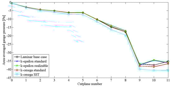Comparison of area-averaged gauge pressure for the laminar base-case and four different turbulent models [].
