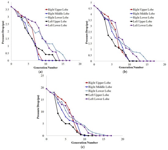 Pressure drop along a selected path line of lobes. (a) 7.5 lpm, (b) 9 lpm, and (c) 25 lpm [].