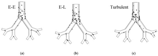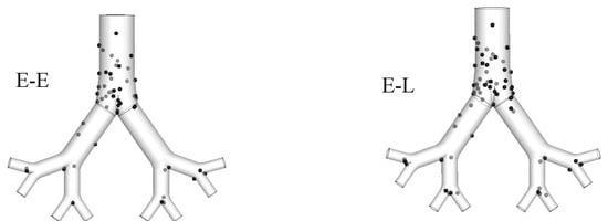 While the E-E approach neglects the inertia effect on particle transport and considers both the disperse and continuous phase as an interpenetrating field [], the E-L method usually solves the particle trajectory equations by incorporating all relevant forces []. However, the E-E approach is more effective for particle size dp ≤ 100 nm compared to the E-L method, as the inertia of the larger diameter particle influence the overall deposition pattern []. The E-E method is more effective than the E-L method for a larger number of particles [] although the inertia effect has to be considered for larger diameter particles. This study performed the influence of the E-E and E-L methods on nanoparticle deposition for a triple bifurcation airway model (Figure 5). The deposition pattern of a 50-nm diameter particle at 25 lpm flow rate showed no significant difference for both cases.
