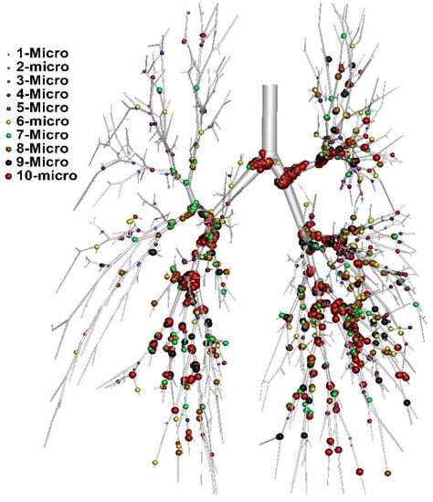 Recently, Islam, Saha, Gemci, Yang, Sauret and Gu [] produced a more detailed CFD analysis of polydisperse particle deposition in the terminal airways of a large scale 17-generation model. The 17-generation model considered the entire airway branches. This is the first ever approach to illustrate polydisperse particle deposition in the terminal airways. Figure 7 shows the polydisperse particle deposition at 60 lpm flow rate with the different colours representing the various diameters of particles. The overall deposition pattern shows that larger diameter particles are deposited at the bifurcation areas of the upper airways and smaller diameter particles are deposited at the terminal airways of different lobes.