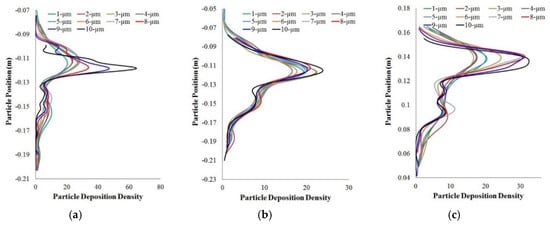 Particle deposition density comparison at different lobes of a 17-generation lung model. (a) right upper; (b) right middle; (c) right lower; (d) left upper; (e) left lower. Particle deposition density is the number of deposited particles and deposition concentration is calculated along the y-axis of the corresponding lobes [].