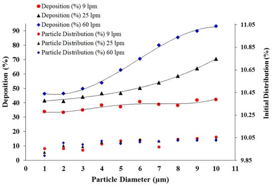 Polydisperse particle initial distribution and deposition efficiency at different flow rates [].