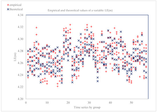 In the estimated model, the coefficient of determination was 0.84, which confirms that the equation explains 84% of the variability of the explained. Hence, the model was well fit to the data. The standard error of the rests, that is, the root of rests’ variance describes the behavior of the explained variable. For model 1, it was equal to 1004, which means that the estimated LE(m) = 0 will change, on average, by ±1004 units. H0 hypothesis: experiential distribution has a normal distribution. Asymptotic test statistics: z = −0.197331 with p = 0.843568. Figure 1 illustrates the empirical and aligned values of the model 1 variable.