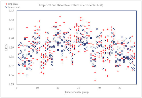 The determination coefficient for model 2 took a value of 0.81, which shows that the equation explains 81% of the variability of the dependent variable. The model very well fitted the empirical data. The standard error was 1.010, which means that the estimated LE 0 will change, on average, by ±1010 units. H0 hypothesis: experiential distribution has a normal distribution. Doornik–Hansen test (1994) transformed skewness and kurtosis: chi-square(2) = 0.572684 with p = 0.751006. Figure 2 shows the empirical and aligned values of the model 2 dependent variable.